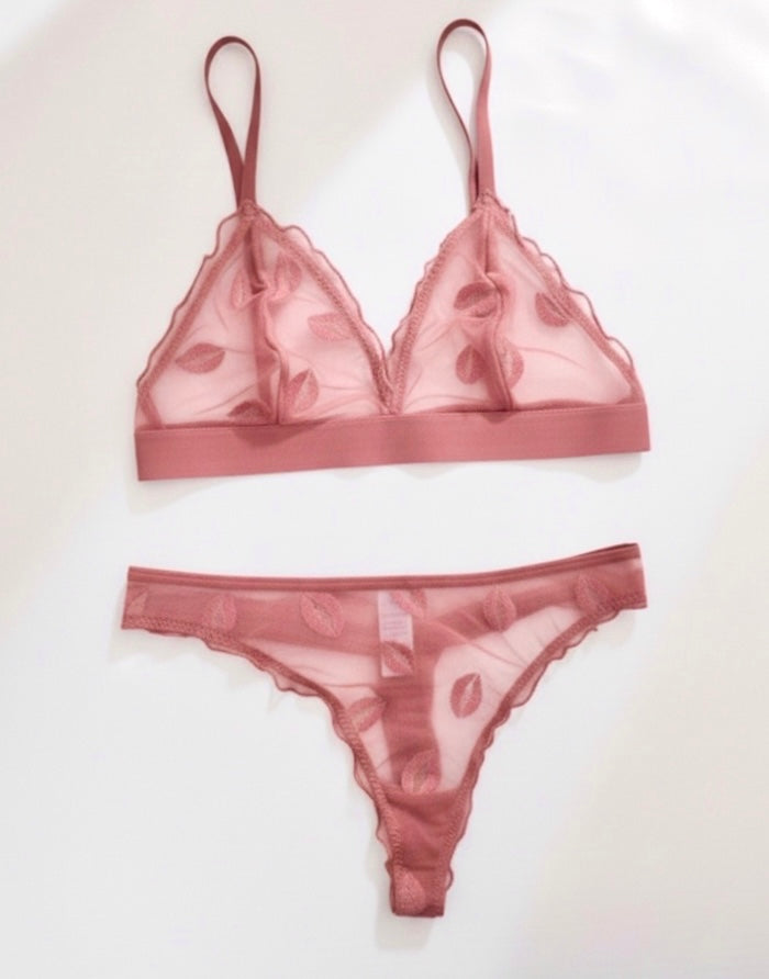 Bralette y panty con estampado de besos bordados